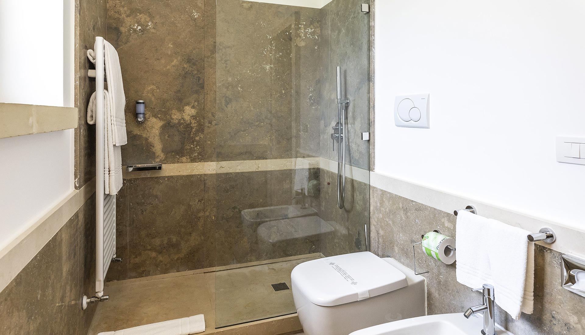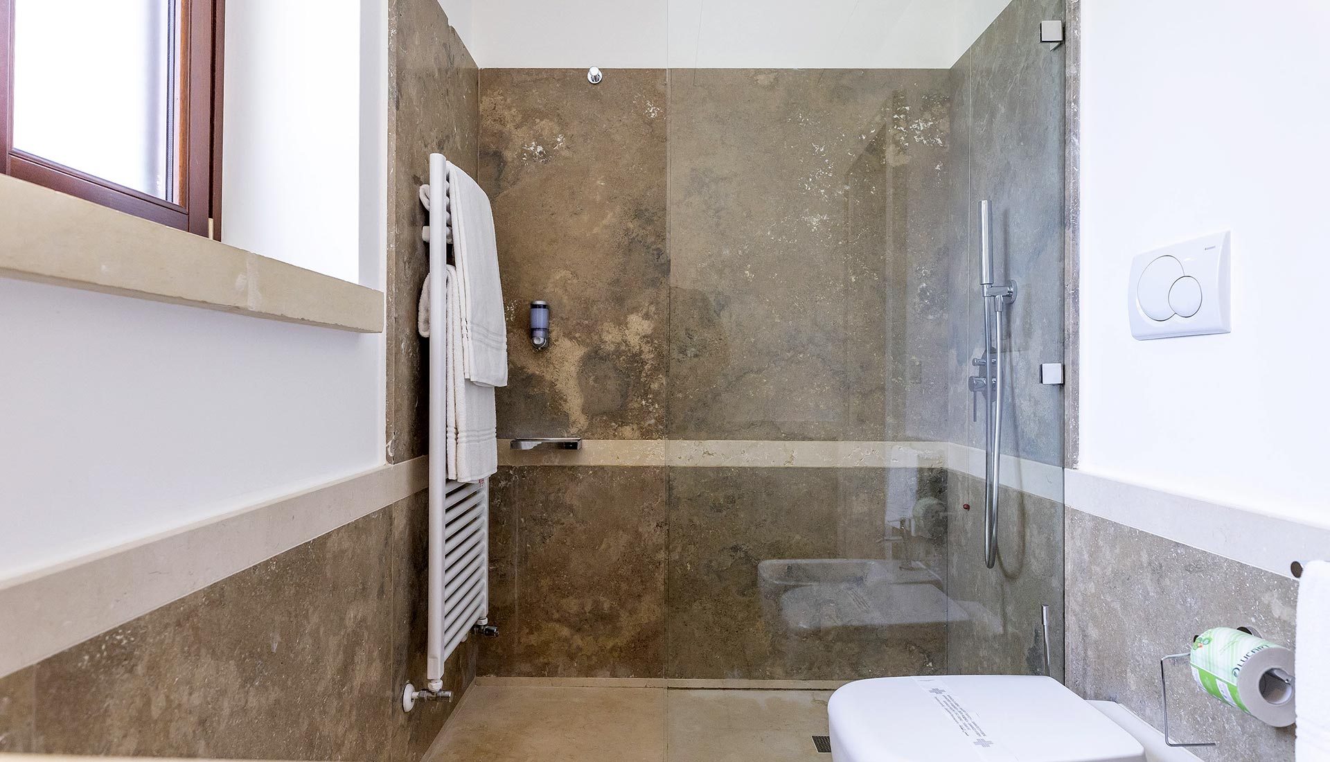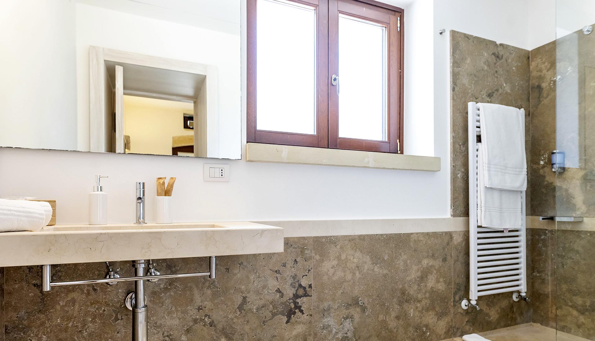 I servizi igienici sono impreziositi con marmi di Trani e travertino noce, il box doccia è ampio e con cristalli temperati.
